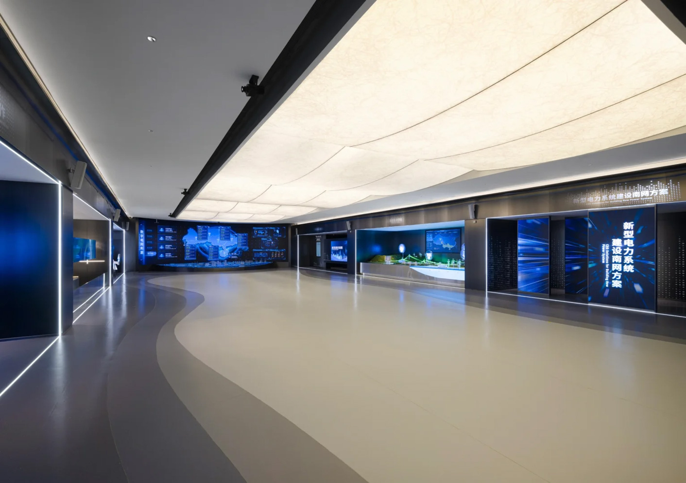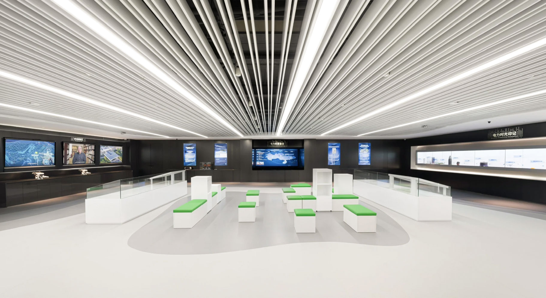 建筑首层层高5.2 m,二层3.65 m。原一层为展示大厅,二层为办公室及休息室。米兰milan(中国)_米兰平台(中国)科技有限公司装饰对一、二层进行全面的装修、暖通、给排水及强弱电系统升级改造,实现的功能为新型电力系统展厅,集中呈现海南电网在新型电力系统领域的最新技术成果。